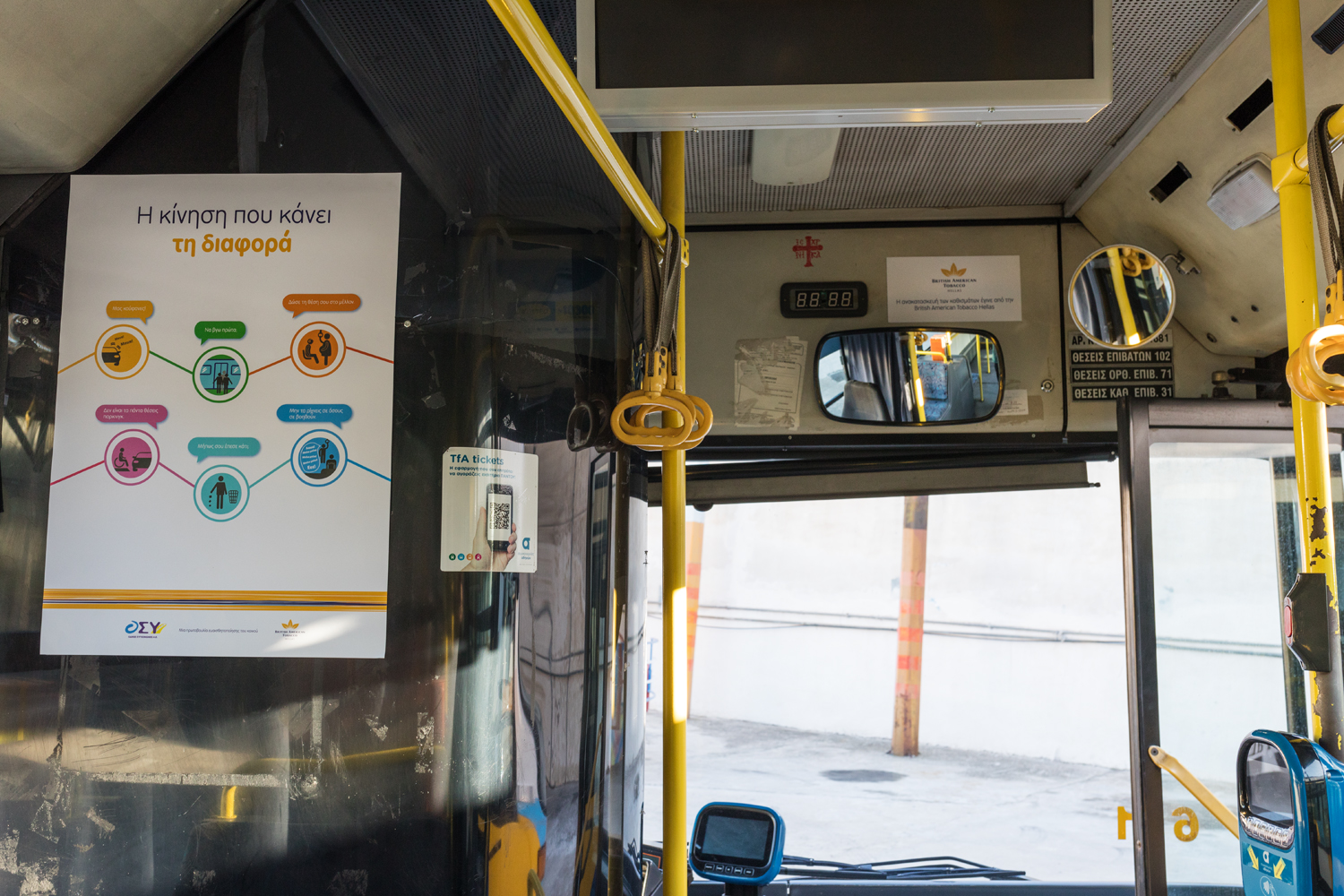 Πρόκειται για τρία λεωφορεία που ανακαινίστηκαν από την British American Tobacco Hellas κα παραδόθηκαν στο υπουργείο Μεταφορών και στις Οδικές ΟΣΥ ΑΕ, εταιρεία του ομίλου ΟΑΣΑ. Τρία λεωφορεία που καλούν τους πολίτες να πραγματοποιήσουν την «Κίνηση που κάνει την διαφορά» υιοθετώντας «χρυσούς κανόνες» για την ποιότητα ζωής στην πόλη, όπως είναι ο σεβασμός στις ειδικές ομάδες και στους εργαζόμενους στις μεταφορές, το νόμιμο παρκάρισμα και η αποφυγή ενεργειών που δημιουργούν προβλήματα στην πόλη, όπως η ηχορύπανση.